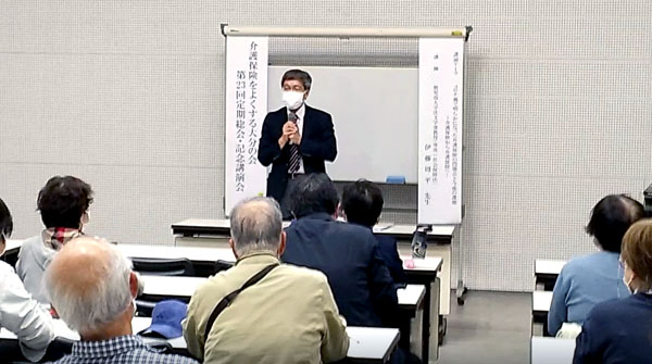 この総会の記念講演会では、鹿児島大学法学部の伊藤周平教授が「コロナ禍で明らかになった介護保険の問題点と今後の課題―介護保険から介護保障」というテーマでお話しをされました。
